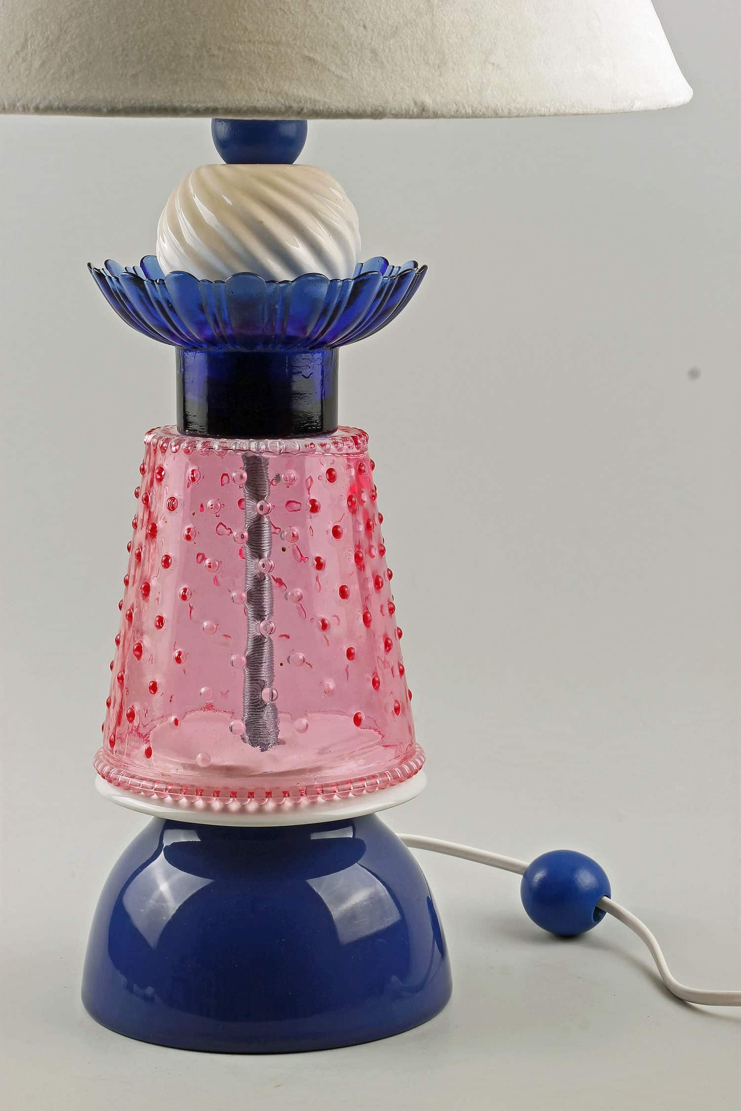 Material: Porslin, glas och trä, Vit sladd med strömbrytare och dekorativ träkula. Vit gängad E27-lamphållare med tillhörande skärmringar. Nytillverkad lampskärm medföljer.